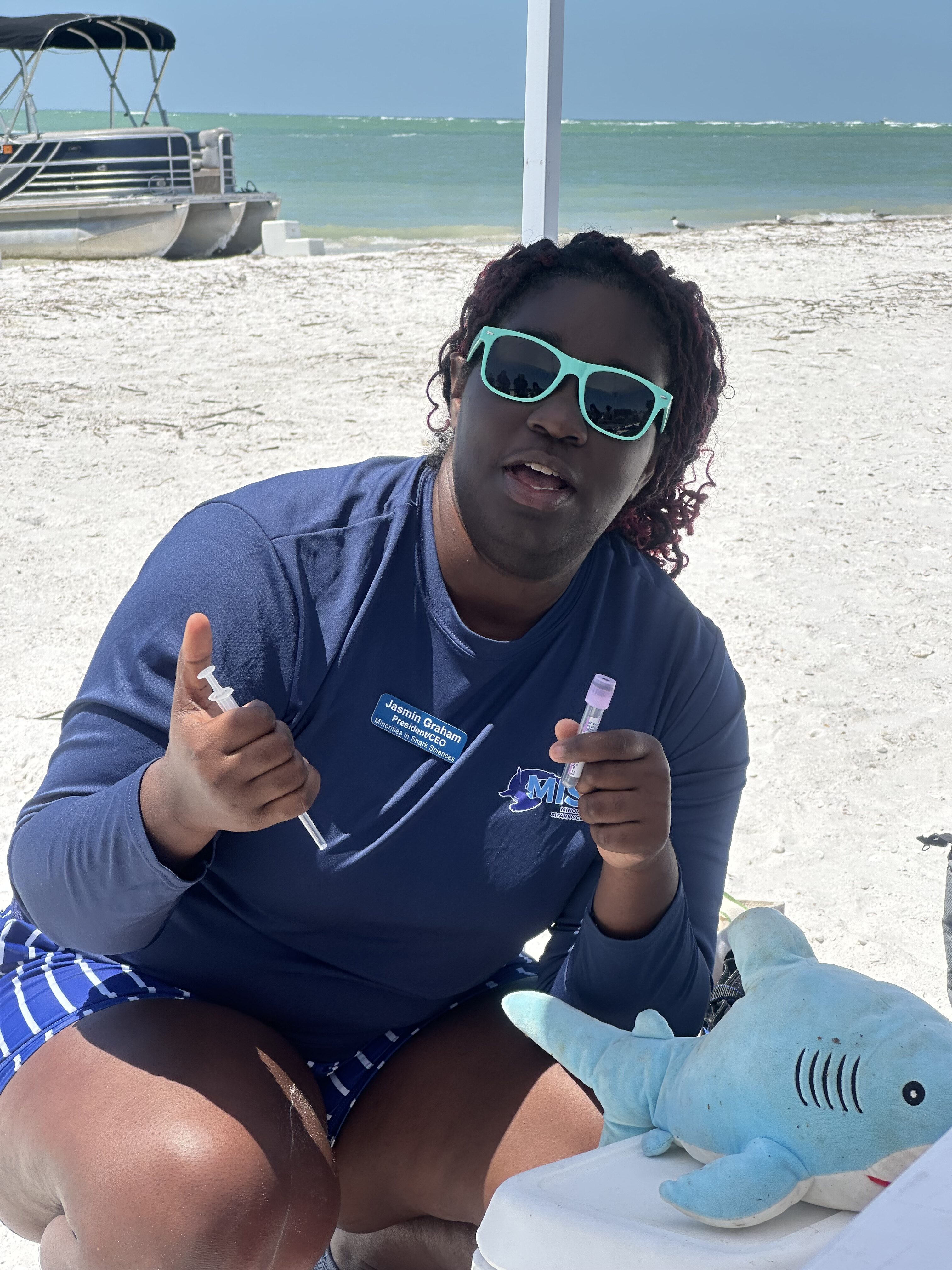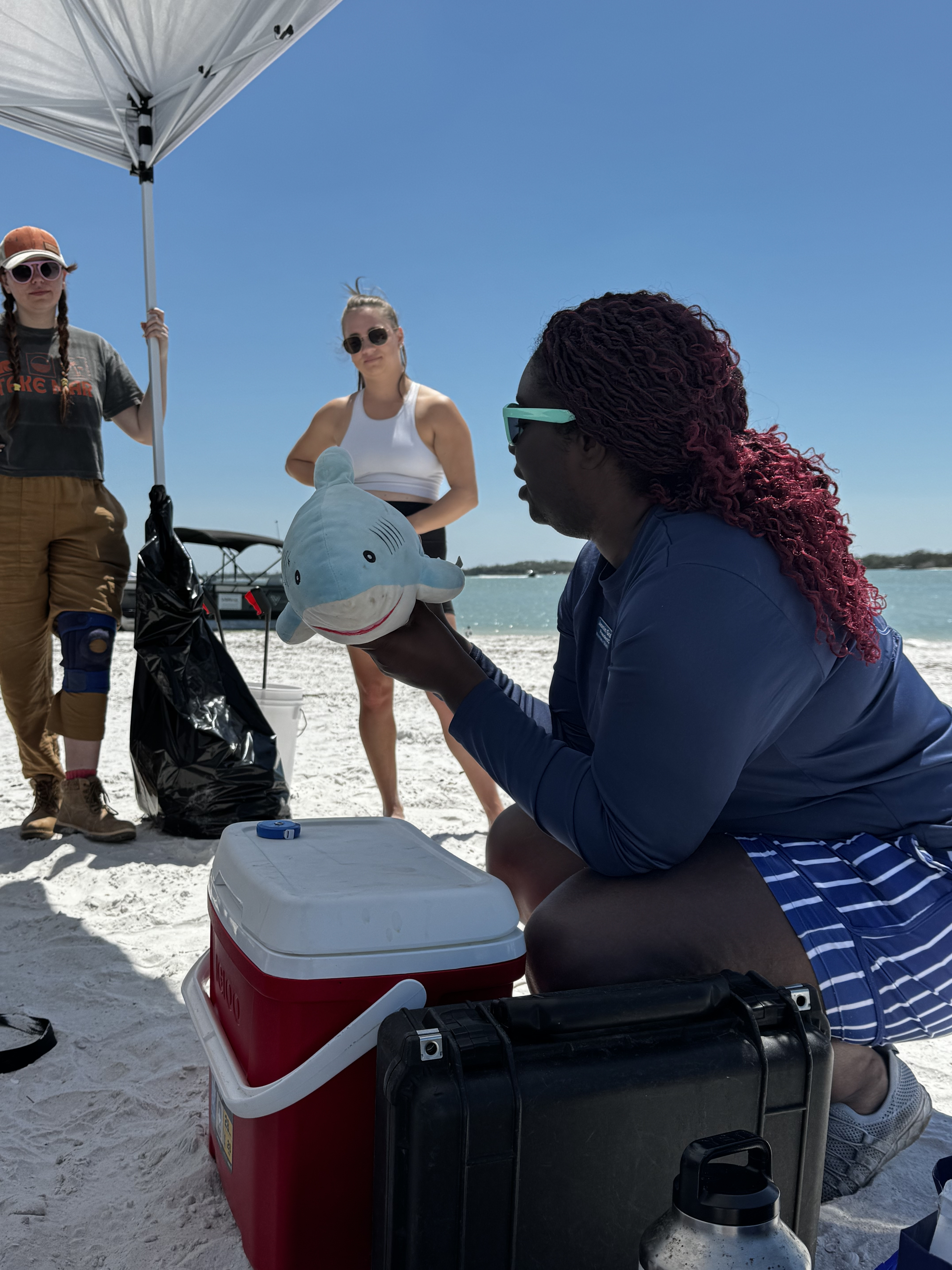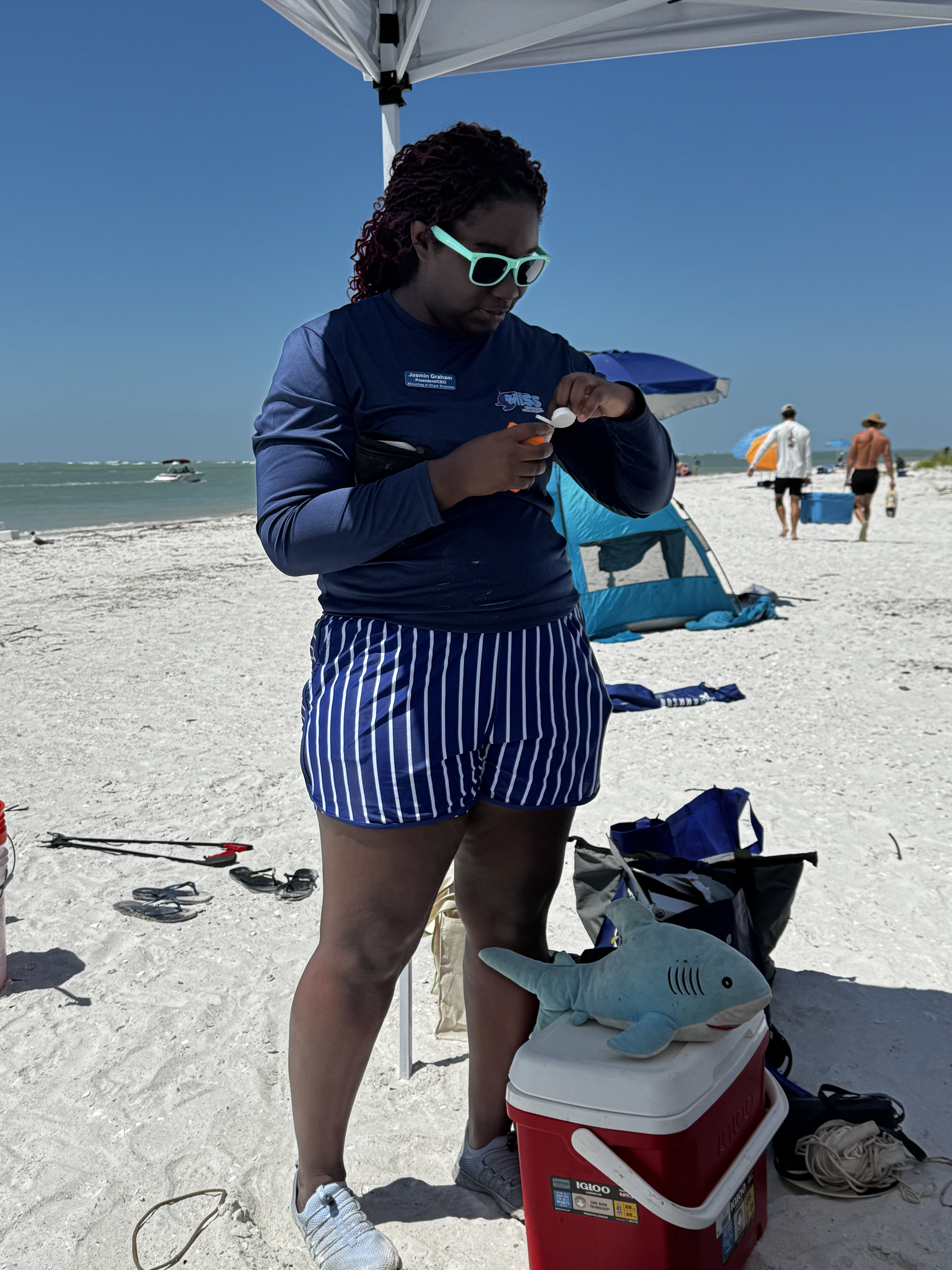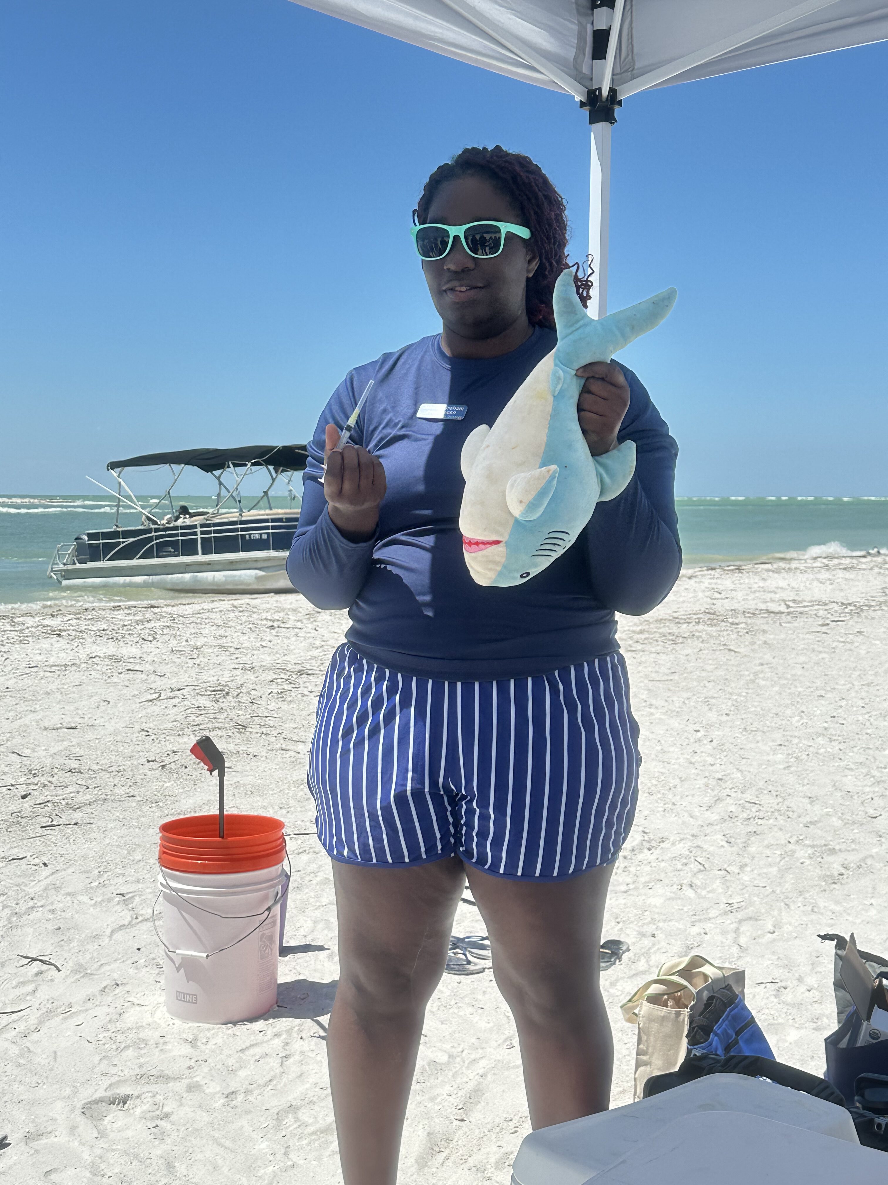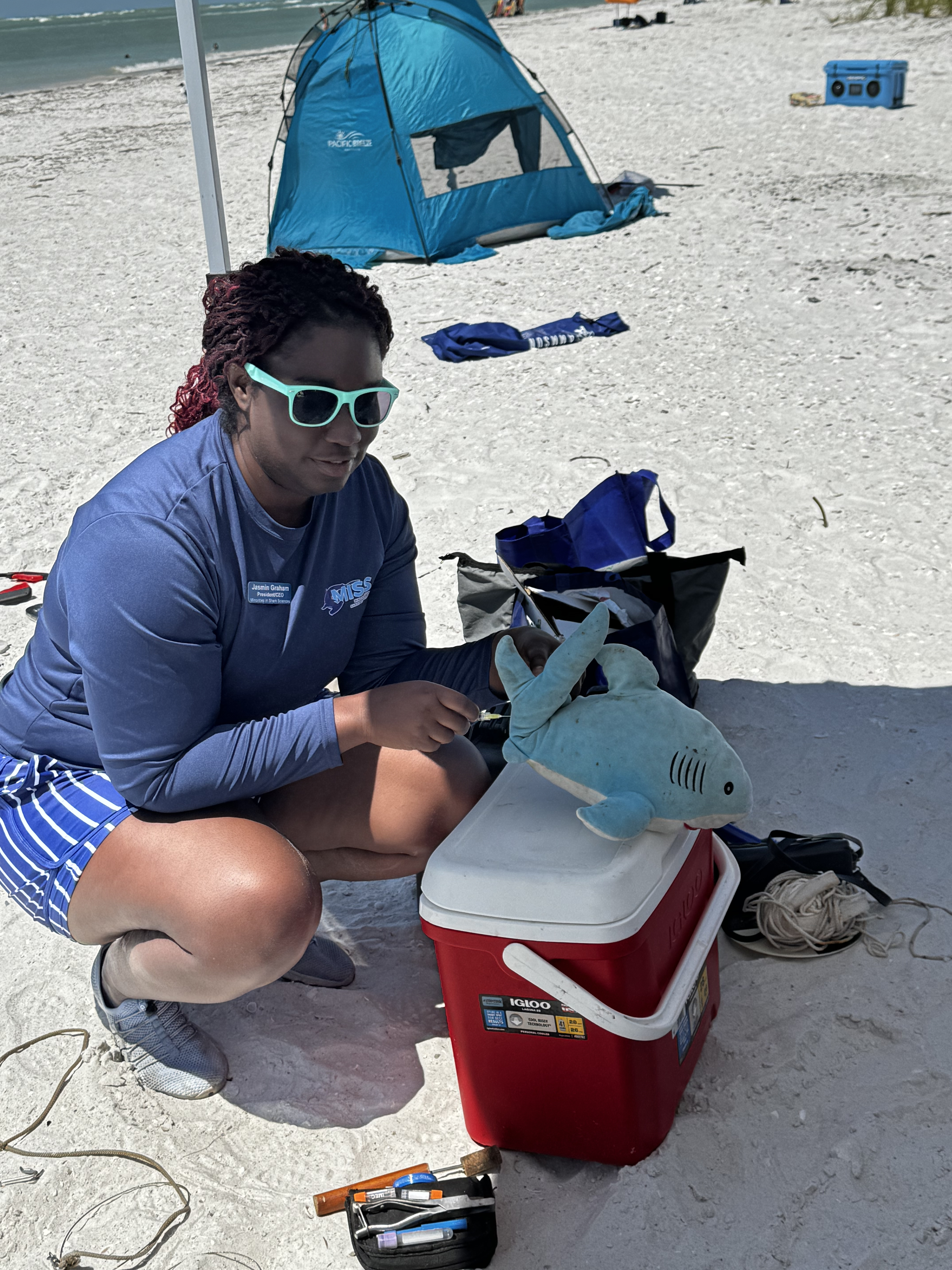 A huge highlight of the day was the hands-on shark science demonstration by Jasmine from Minorities in Shark Science (MISS). Using their trusty stuffed shark, Timmy, Jasmine walked attendees through the real-life field process of studying sharks – including blood sampling, checking vitals, and explaining all the tools marine scientists use.