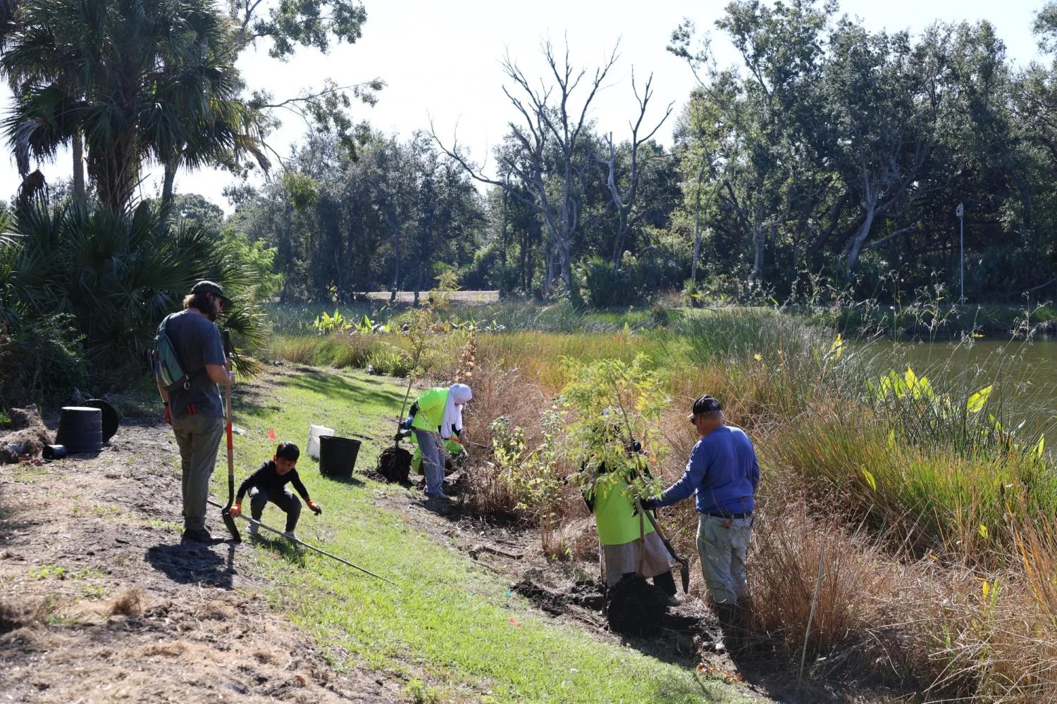 With nineteen dedicated volunteers, we planted thirty four bald cypresses ranging from small one gallon trees to impressive thirty gallon specimens! As we worked, we were treated to the unique sights and sounds of the nearby MacDill Air Force Base with planes soaring overhead and a surprising variety of local bird species enjoying the habitat around the pond. An unexpected highlight was a puppy meet up taking place in the park which added extra smiles to the day.